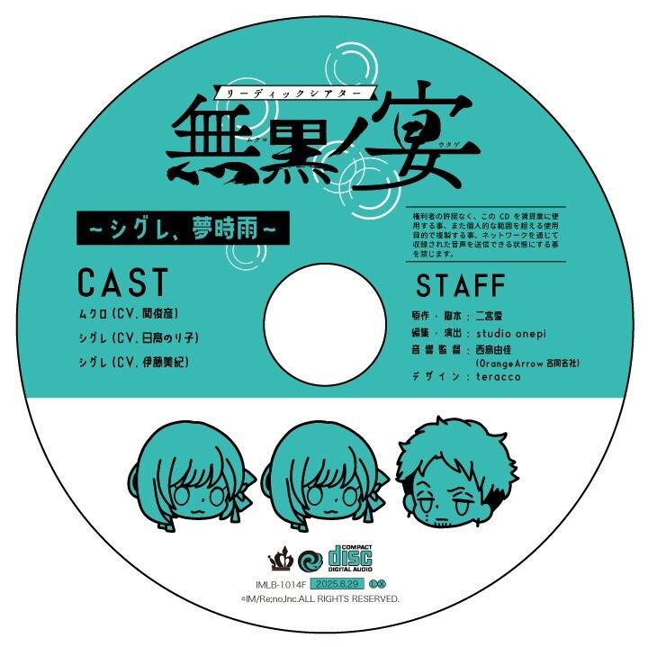 リーディックシアター「無黒ノ宴」音之刻(2/8一公演、2/9一公演)、葉之刻(3/29一公演、3/30一公演)の本編映像に、映像特典や音声特典を収録した豪華2枚組Blu-rayに加え、付属のCDには音之刻 シグレ役 竹内順子が歌う「無黒ノ宴」主題歌フルバージョン、インストバージョンや音葉スペシャル座談会が楽しめるスペシャル仕様!